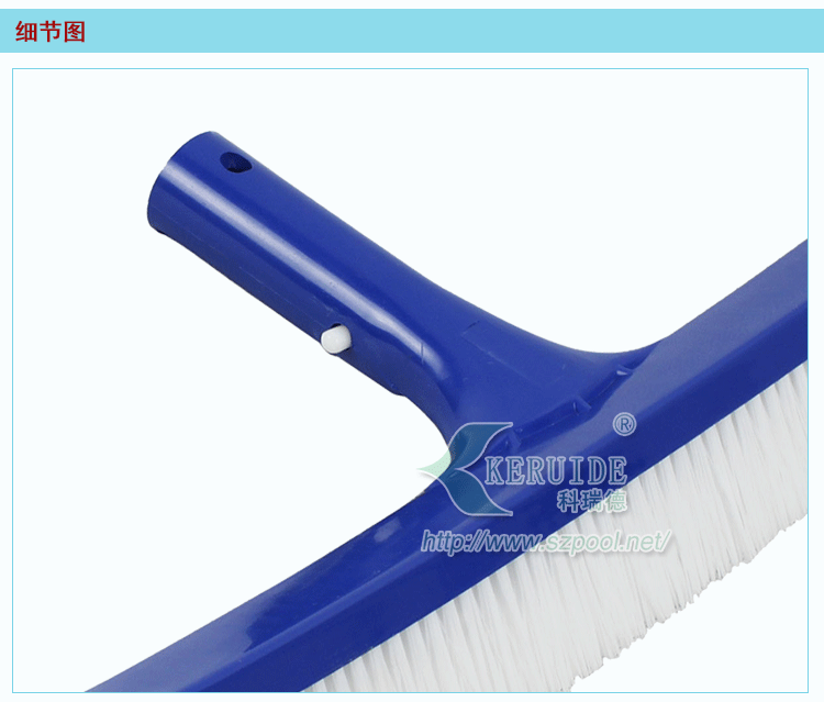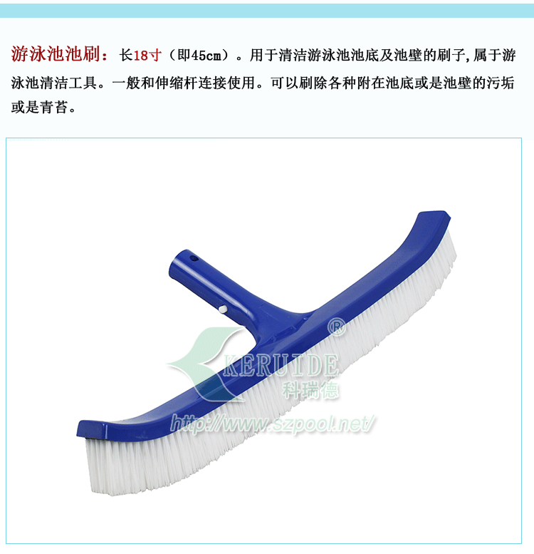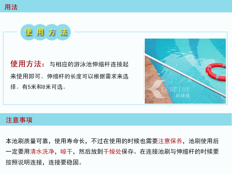 【注意】:池刷是和伸縮桿相連使用的,要正確安裝,以防不穩定在刷洗過程中脫落。其次,刷洗完之后要將刷子刷洗干凈。
