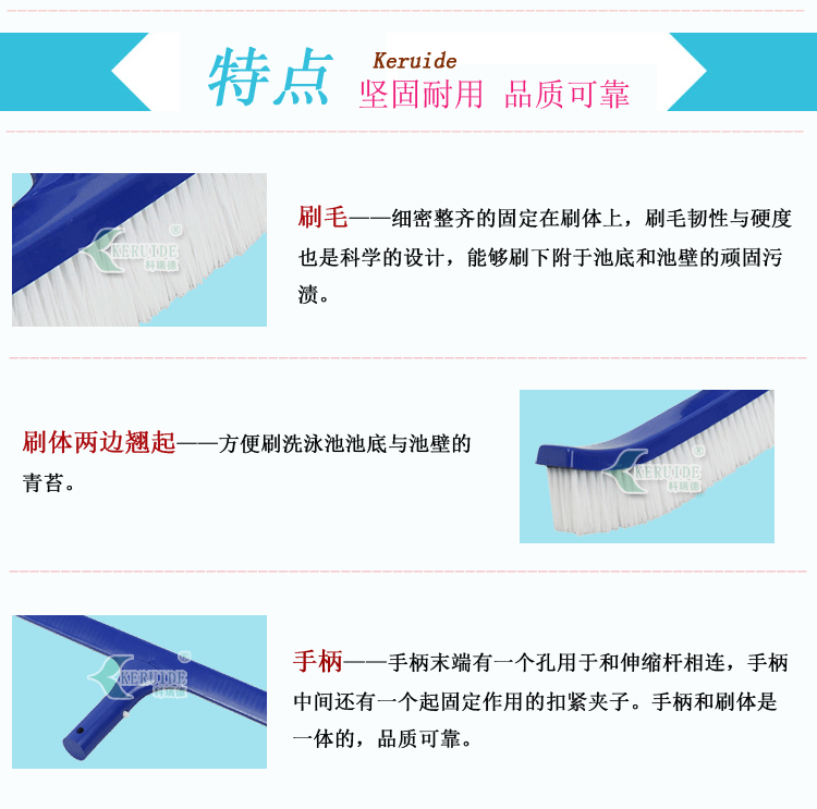 刷體兩邊翹起:人性化設計方便刷洗泳池池底與池壁的連接處。