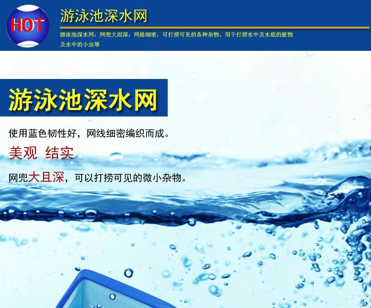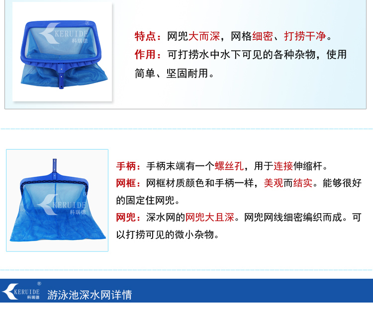 【游泳池深水網】:網兜大而深,網格細密,可打撈可見的各種雜物。主要用于打撈水中及水底的臟物及水中的小蟲等。