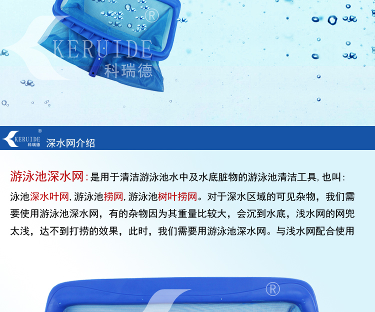 游泳池深水網是用于清潔游泳池水中及水底臟物的游泳池清潔用品,也叫: 泳池深水葉網,游泳池撈網,游泳池樹葉撈網。對于深水區域的可見雜物,我們需要使用游泳池深水網,有的雜物因為其重量比較大,會沉到水底,淺水網的網兜太淺,達不到打撈的效果,此時,我們需要用游泳池深水網。與淺水網配合,清潔泳池。