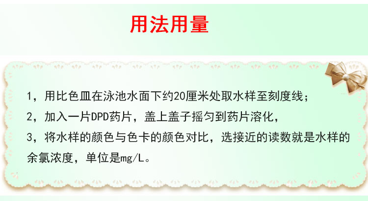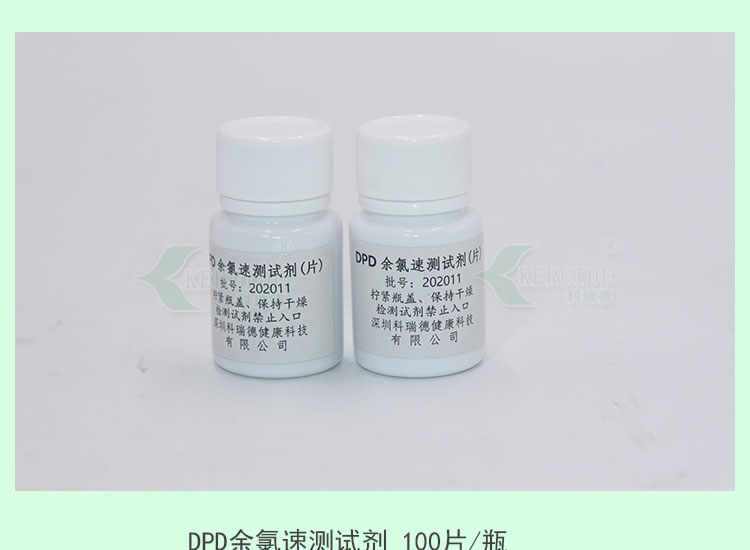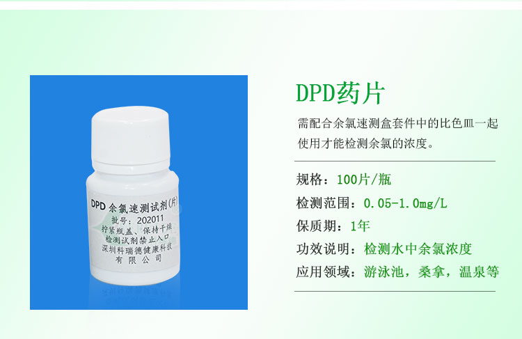 DPD試劑的檢測范圍是:0-1.0mg/L,每瓶有100片。需配合余氯速測盒套件中的比色皿一起使用才能檢測余氯的濃度。