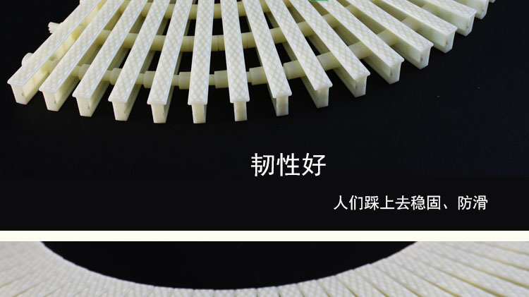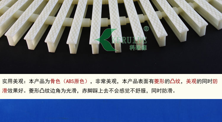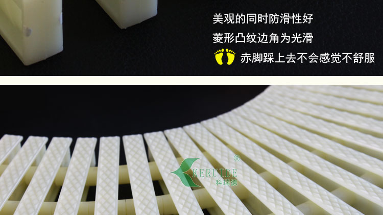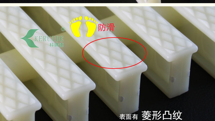 格柵表面有凸紋,防滑效果好,就算是赤腳踩上去也不會(huì)滑到。安全系數(shù)極高。并且紋路特別,配合骨色的材質(zhì),整體非常美觀。此外,本格柵安裝與拆卸都非常方便。