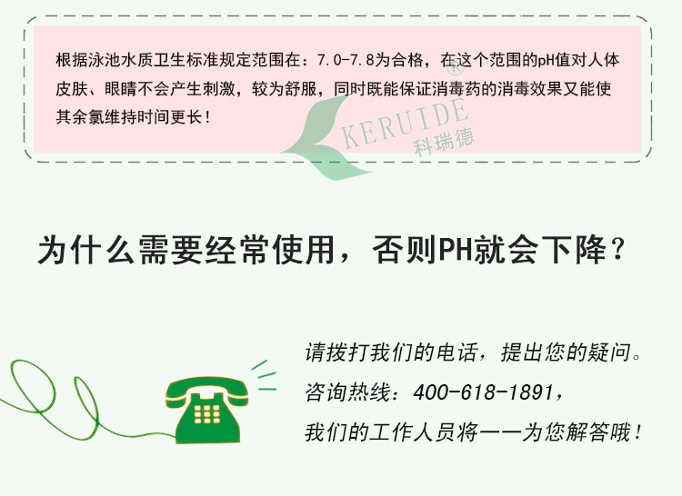 友情提示:根據泳池水質衛生標準規定范圍在:7.0-7.8為合格,在這個范圍的pH值對人體皮膚、眼睛不會產生刺激,較為舒服,同時既能保證消毒藥的消毒效果又能使其余氯維持時間更長!?