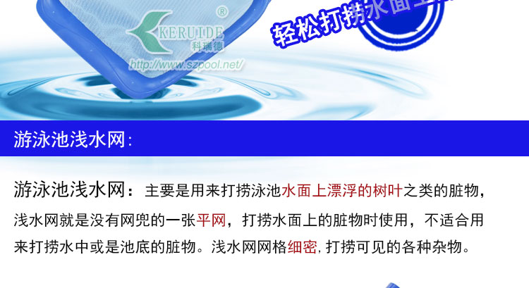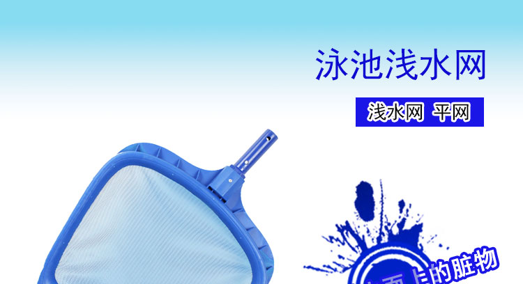 游泳池淺水網(wǎng):也叫淺水打撈網(wǎng),主要是用來打撈泳池水面上漂浮的樹葉之類的臟物,淺水網(wǎng)就是沒有網(wǎng)兜的一張平網(wǎng),打撈水面上的臟物時可以較為省力,不適合用來打撈水中或是池底的臟物。