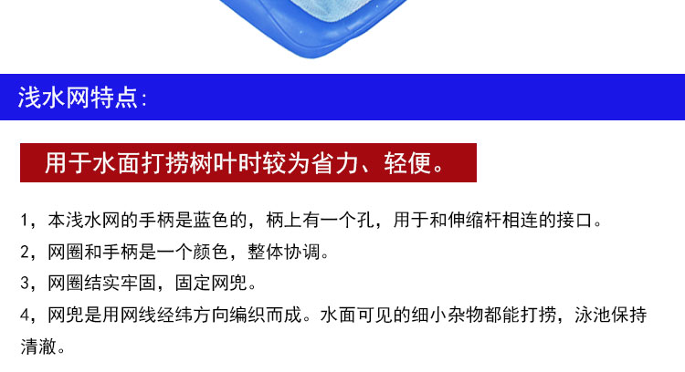 1,本淺水網(wǎng)的手柄是藍色的,柄上有一個孔,用于和伸縮桿相連的接口。