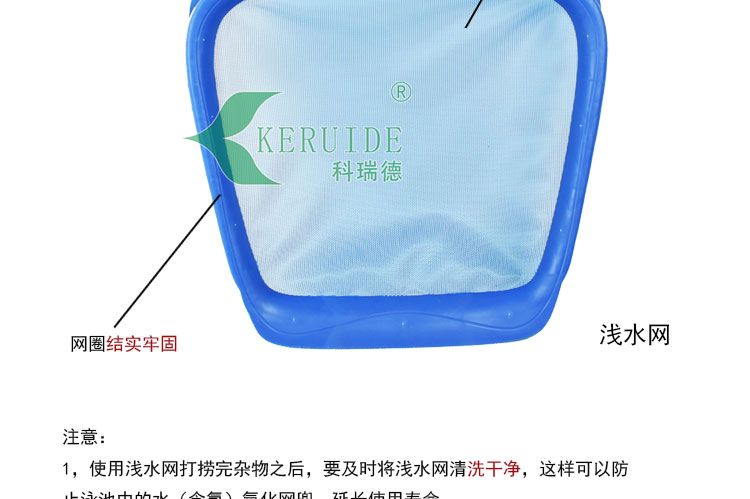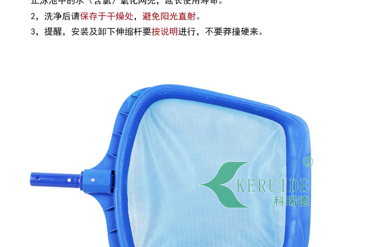 1,使用淺水網(wǎng)打撈完雜物之后,要及時將淺水網(wǎng)清洗干凈,這樣可以防止泳池中的水(含氯)氧化網(wǎng)兜,延長使用壽命。