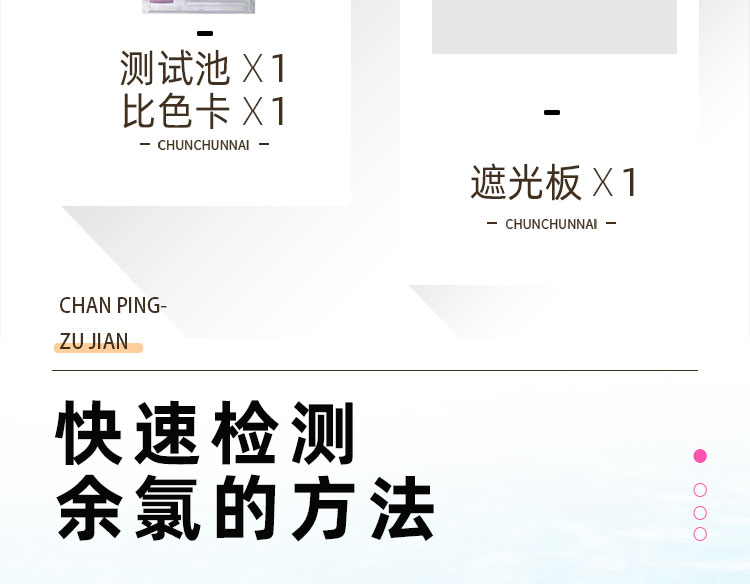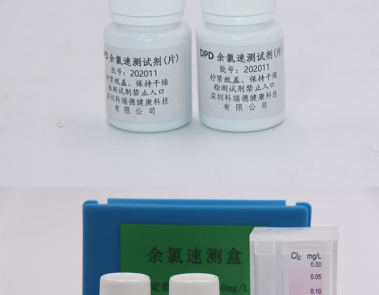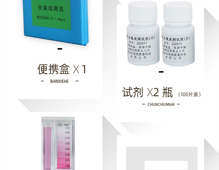 余氯速測盒:是以DPD法進(jìn)行余氯檢測的快速型目測比色盒套件,主要包括外塑料盒、比色皿、DPD試劑兩瓶(200片)。能快速且可靠地現(xiàn)場檢測余氯。