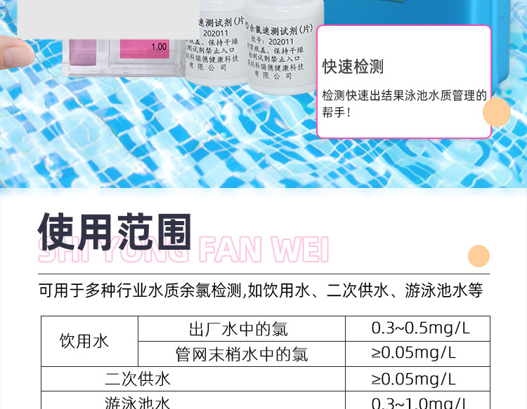 廣泛應(yīng)用于各類游泳池水質(zhì)檢測。DPD余氯快速測定盒已被各類游泳池,桑拿,溫泉等用于檢測水中余氯濃度使用。