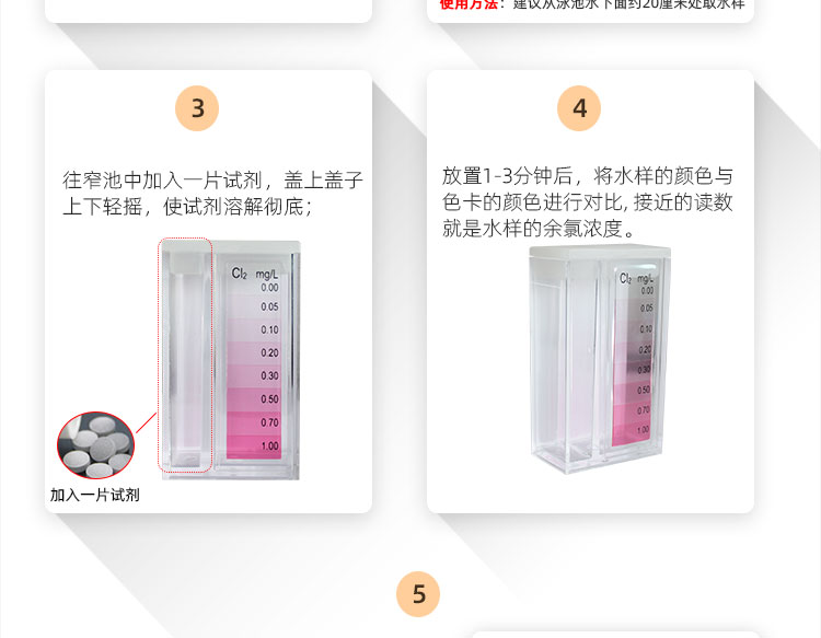 1,用比色皿在泳池水面下約20厘米處取水樣至刻度線;
