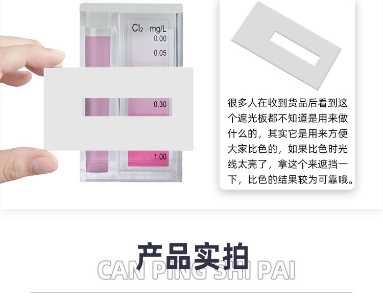 3,將水樣的顏色與色卡的顏色對比,選接近的讀數(shù)就是水樣的余氯濃度,單位是mg/L。