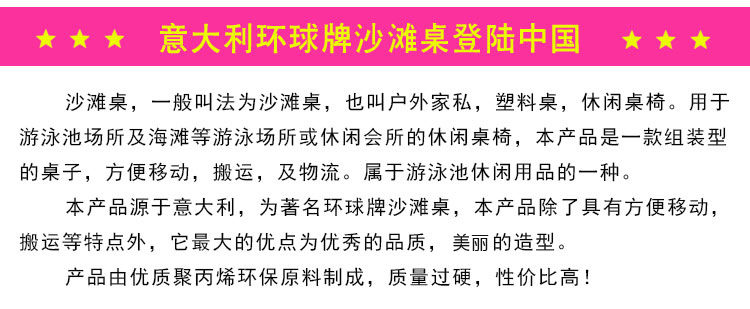 本產品源于意大利,為著名環球牌沙灘桌,本產品除了具有方便移動,搬運等特點外,它最大的優點為優秀的品質,美的造型。