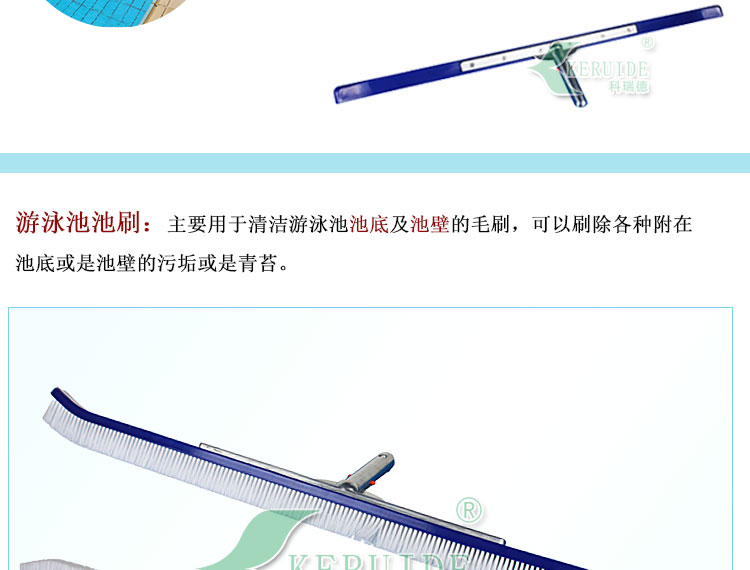 游泳池池刷:主要用于清潔游泳池池底及池壁的刷子,可以刷落各種附在池底或是池壁的污垢或是青苔。