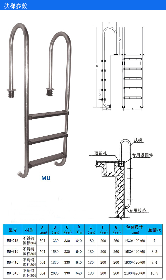 304不銹鋼材質,耐腐蝕性好:相對于其他材質的游泳池扶梯,304不銹鋼材質的扶梯耐腐蝕性好,無論是室內還是室外,多年浸在水里都不會耗損,依然光亮如新。