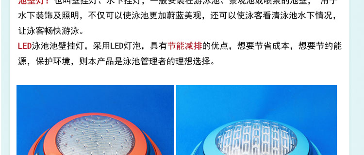 LED泳池池壁掛燈,采用LED燈泡,具有節能減排的優點,想要節省成本,想要節約能源,保護環境,則本產品是泳池管理者的理想選擇。