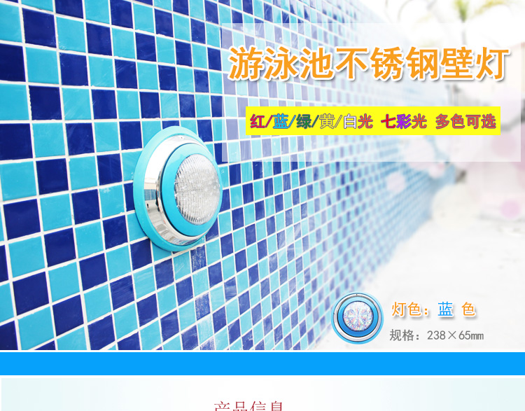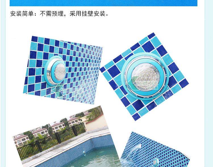 池壁燈:也叫壁掛燈、水下掛燈,一 般安裝在游泳池、景觀池或噴泉的池壁, 用于水下裝飾及照明,不僅可以使泳池更加蔚藍美觀,還可以使泳客看清泳池水下情況,讓泳客暢快游泳。