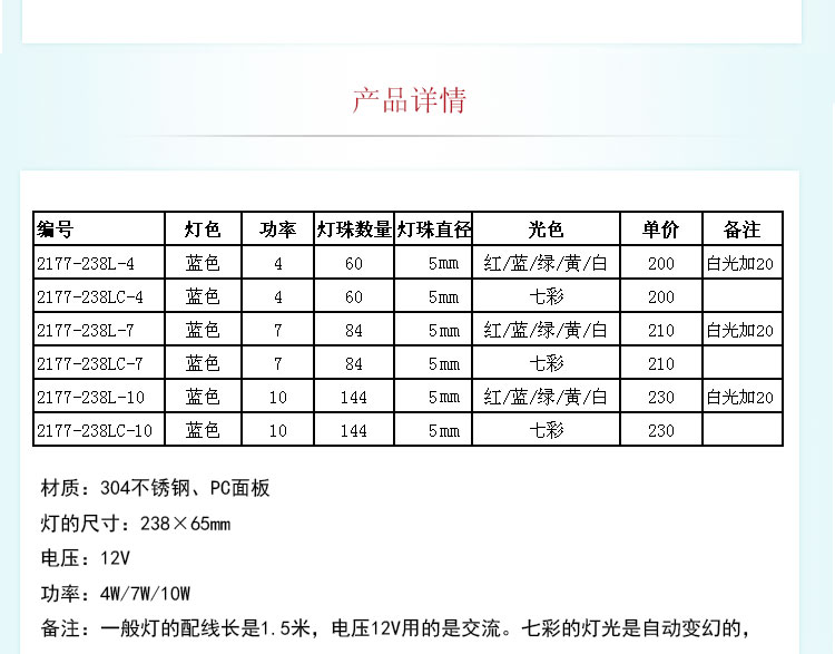顏色:七彩、單色(紅/藍/綠/黃/白)