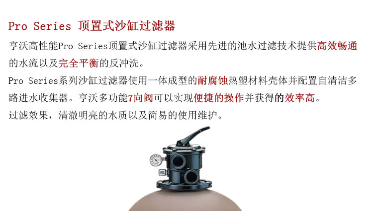 亨沃高性能Pro Series頂置式沙缸過濾器采用先進的池水過濾技術提供,暢通的水流以及完全平衡的反沖洗過濾設備。