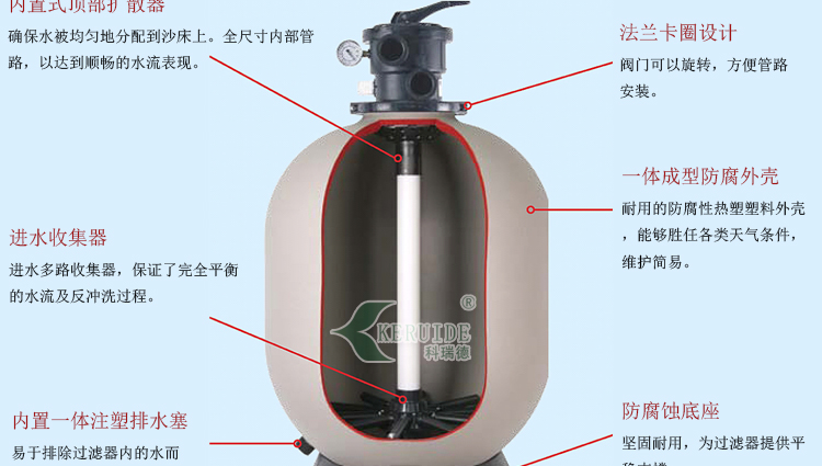 確保水被均勻地分配到沙床上。全尺寸內部管路,以達到順暢的水流表現。