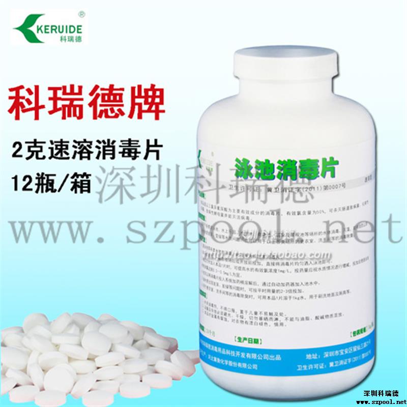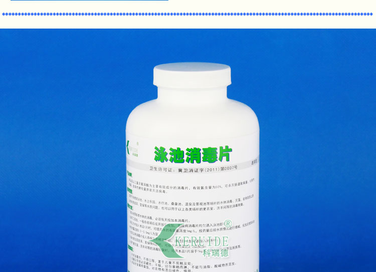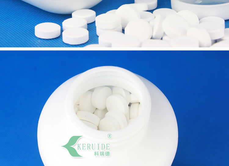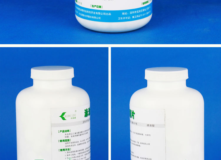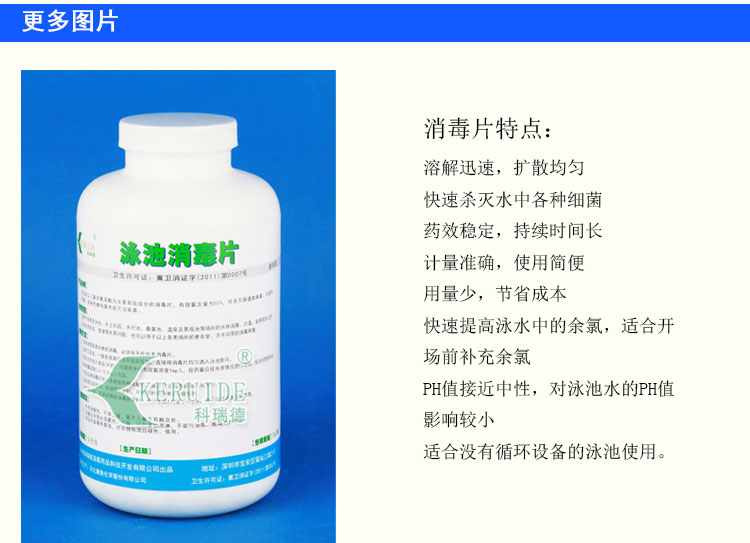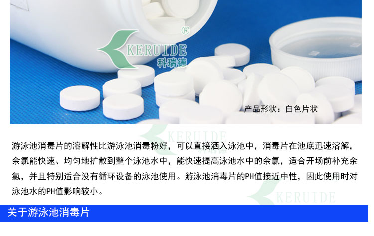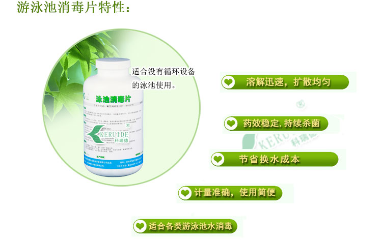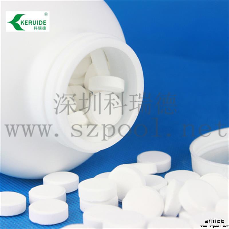 游泳池消毒片的溶解性比游泳池消毒粉好,可以直接灑入泳池中,泳池消毒片在池底迅速溶解,氯能快速、均勻地擴散到整個泳池水中,能快速提高泳池水中的余氯,適合開場前補充余氯,并且特別適合沒有循環設備的泳池使用。游泳池消毒片的PH值接近中性,因此使用時對泳池水的PH值影響較小。