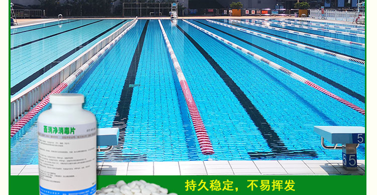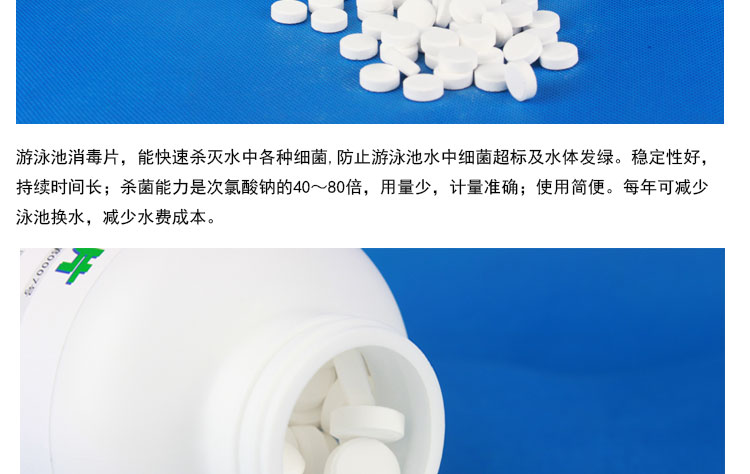 泡騰消毒片主要成分為氯,具有持續殺菌消毒的特點。能快速殺滅水中各種細菌,防止游泳池水中細菌超標及水體發綠。藥效穩定,持續時間長;殺菌能力比普通的藥劑強40-80倍,用量少,計量準確;使用簡便,溶解性好、性質穩定,不易揮發、使用它每年可減少泳池換水,大大減少水費成本。