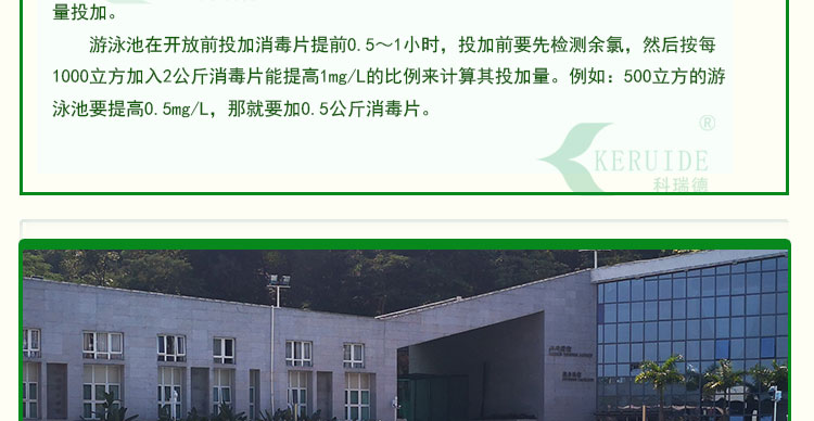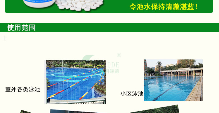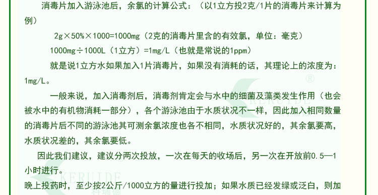 【用法用量】:用于游泳池水消毒時,每天用量約為每1000立方投放2-4公斤,泳客較多或下雨天氣時要適當地增加藥量。游泳池消毒藥劑的投放量足夠時,可以防止水體發白、發綠,使你的游泳池水保持清澈湛藍。