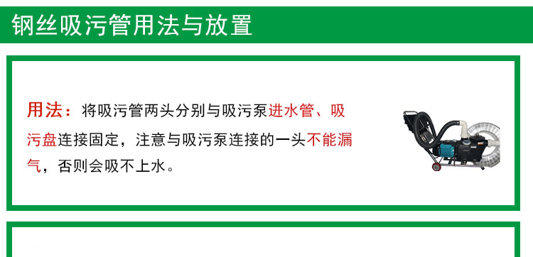 (注:如果池面有樹葉、塑料袋等其他垃圾,請用撈網打撈走,不管是游泳池手動還是自動吸污機都吸不了漂浮于水面的垃圾,另外池壁或池底已長出的青苔不一定能完全吸掉,如遇到此類粘著力較強的污物,需手動使用清潔刷,刷掉,請知悉!)
