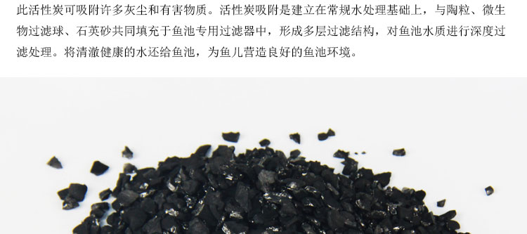 此活性炭是魚池專用過濾材料,可吸附許多灰塵和有害物質。活性炭吸附是建立在常規水處理基礎上,與陶粒、微生物過濾球、石英砂共同填充于魚池專用過濾器中,形成多層過濾結構,對魚池水質進行深度過濾處理。將清澈健康的水還給魚池,為魚兒營造良好的魚池環境。