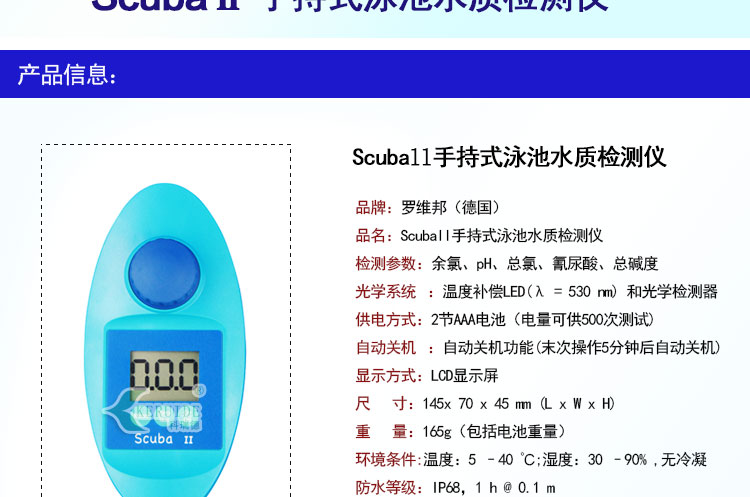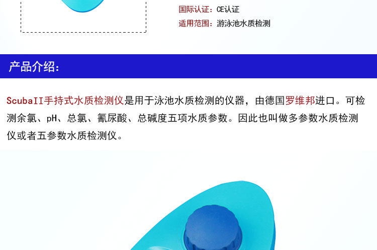 Scuba II手持式泳池水質(zhì)檢測儀是用于泳池水質(zhì)檢測的儀器,由德國羅維邦進(jìn)口。可檢測余氯、pH、總氯、氰尿酸、總堿度五項(xiàng)水質(zhì)參數(shù)。因此也叫做多參數(shù)水質(zhì)檢測儀或者五參數(shù)水質(zhì)檢測儀。