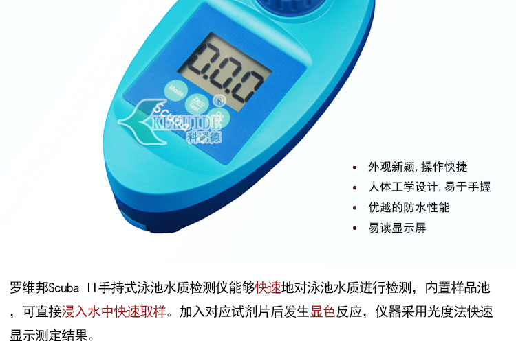 羅維邦ScubaII手持式泳池水質(zhì)檢測儀能夠快速地對泳池水質(zhì)進(jìn)行檢測,內(nèi)置樣品池,可直接浸入水中快速取樣。加入對應(yīng)試劑片后發(fā)生顯色反應(yīng),儀器采用光度法快速顯示測定結(jié)果。