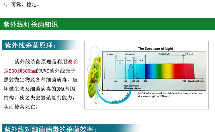紫外線殺菌原理是利用波長(zhǎng)是200到300nm的UVC紫外線光子照射微生物及各種細(xì)菌病毒,破壞微生物及細(xì)菌病毒的DNA基因結(jié)構(gòu),使之失去繁殖復(fù)制能力,從而使其死亡。紫外線UVC可以在一到數(shù)秒內(nèi)殺死空氣中和水中大部分細(xì)菌病毒及其他微生物,尤為可貴的是紫外線可以殺死一些常規(guī)化學(xué)方法如加氯難以殺死的病毒。和其他殺菌方法例如化學(xué)制劑消毒相比,利用UVC紫外輻射殺菌是經(jīng)濟(jì)環(huán)保的殺菌方法。