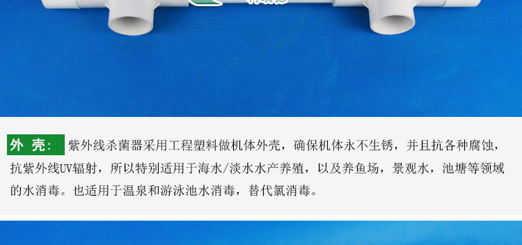 此魚池紫外線殺菌燈的功率為20w,流量為0.9立方/小時(shí),環(huán)保高效。此款為小功率的魚池紫外線殺菌燈。可以根據(jù)用戶要求定制特殊規(guī)格產(chǎn)品,具體可按每小時(shí)循環(huán)水量來配套相應(yīng)的規(guī)格。可以滿足各種大小水體的水殺菌要求,為各種水體殺菌提供解決方案。適用于凈化海水和淡水養(yǎng)殖,魚缸、魚塘、水族館,游泳池、溫泉、景觀水體等。