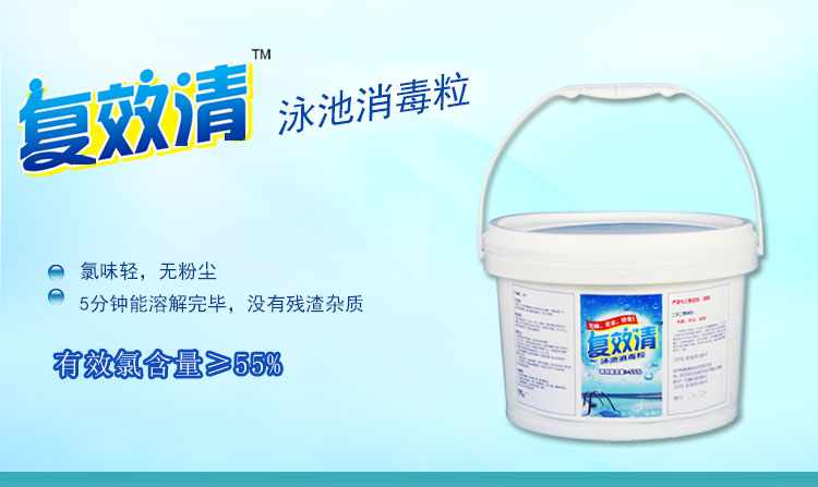 1、游泳池等各類水體的消毒,須每天投加復效清泳池消毒粒。