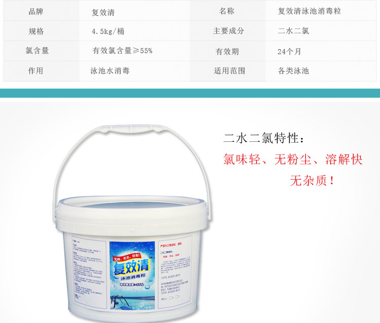 復效清泳池消毒粒是一種含氯消毒劑,屬于普通化學品,避免了在運輸、儲存及使用過程中的安全隱患!是三氯等危化類消毒劑的理想替代品!