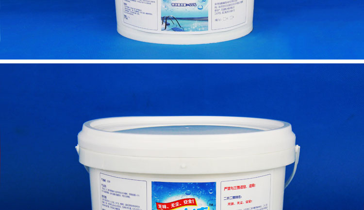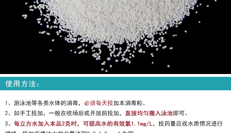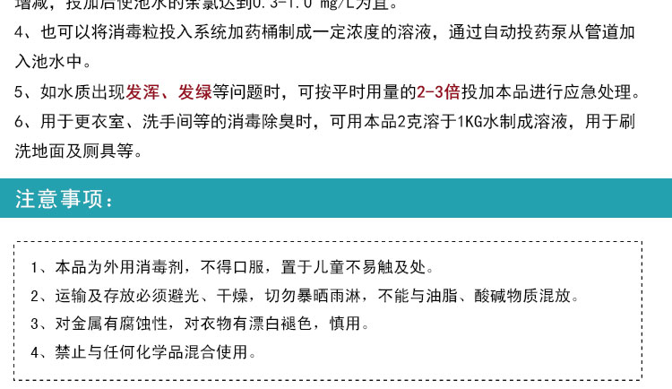 3、每立方水加入本品2克時,可提高水的有效氯1.1mg/L,投藥量應視水質情況進行增減,投加后使池水的余氯達到0.3-1.0 mg/L為宜。