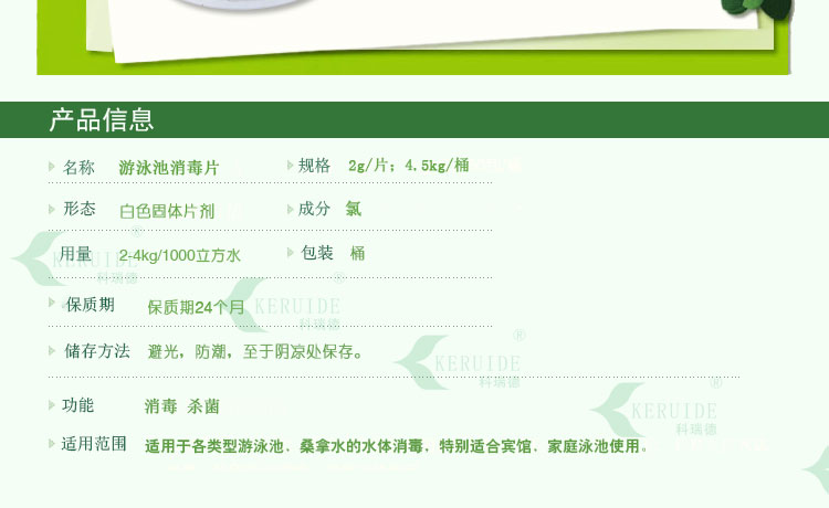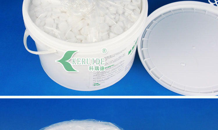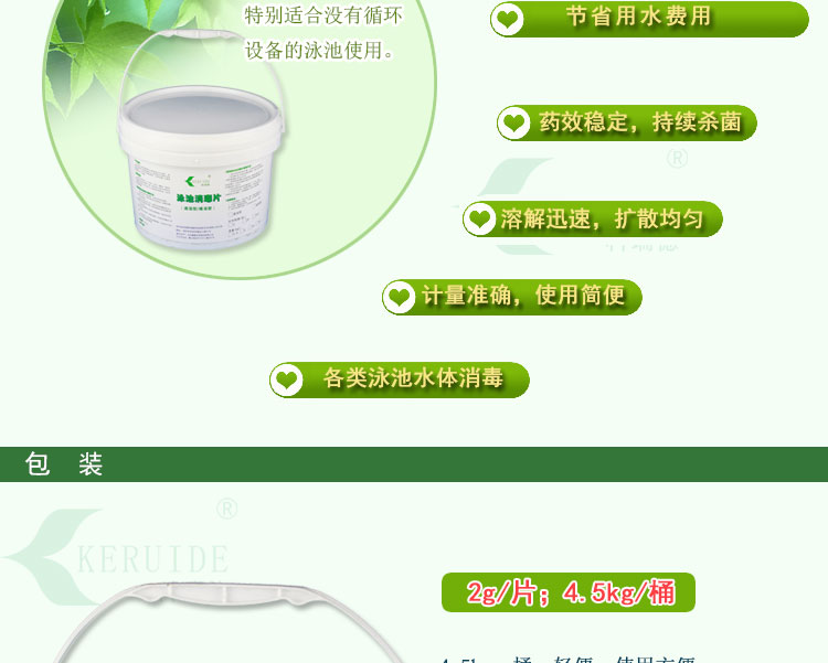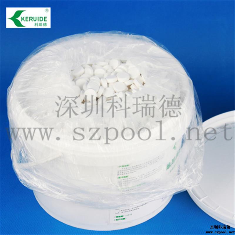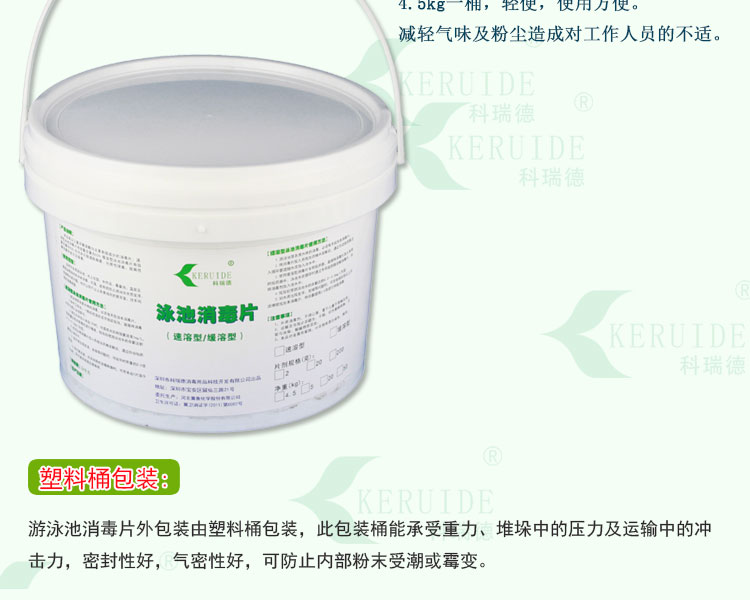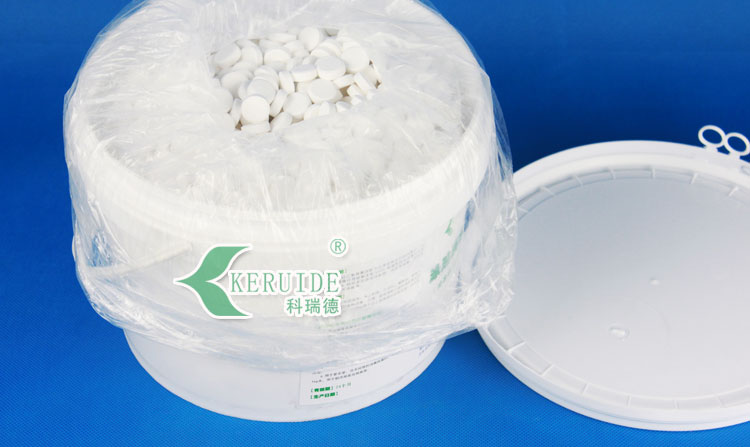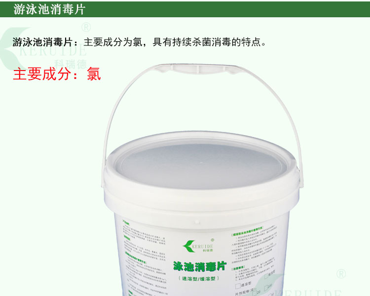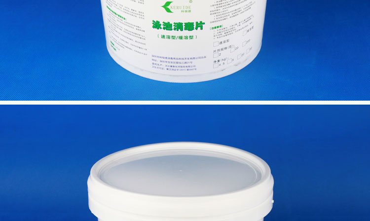 4.5kg/桶的消毒片:主要成分也是氯,主要由氯復配而成的泳池水處理劑,能迅速溶解,因此也叫速溶消毒片或氯丸。