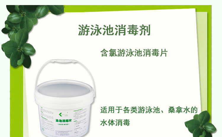 游泳池消毒片,又名含氯消毒片,具有持續殺菌消毒的特點。游泳池、桑拿水處理劑。能快速殺滅水中各種細菌,防止游泳池水中細菌超標及水體發綠。游泳池消毒片藥效穩定,持續時間長;殺菌能力是次氯酸鈉的40~80倍,用量少;使用簡便,溶解快。適合各類游泳池場所選擇,每年可減少泳池換水,大大減少水費成本。
