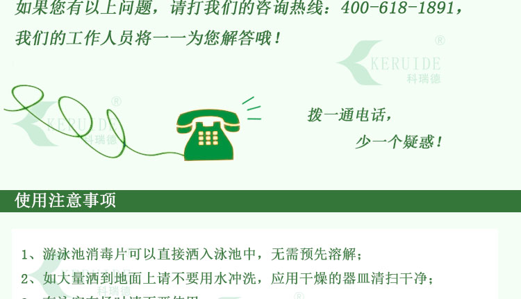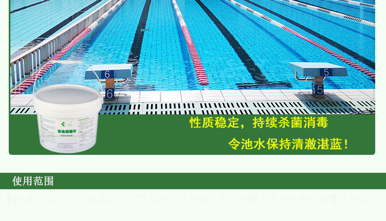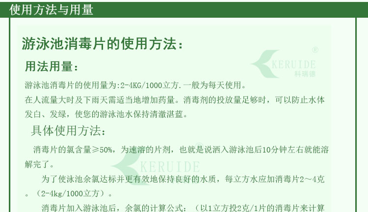 【用法用量】:用于游泳池水消毒時,每天用量約為每1000立方投放2-4公斤,泳客較多或下雨天氣時要適當地增加藥量。消毒劑的投放量足夠時,可以防止水體發白、發綠,使你的游泳池水保持清澈湛藍。