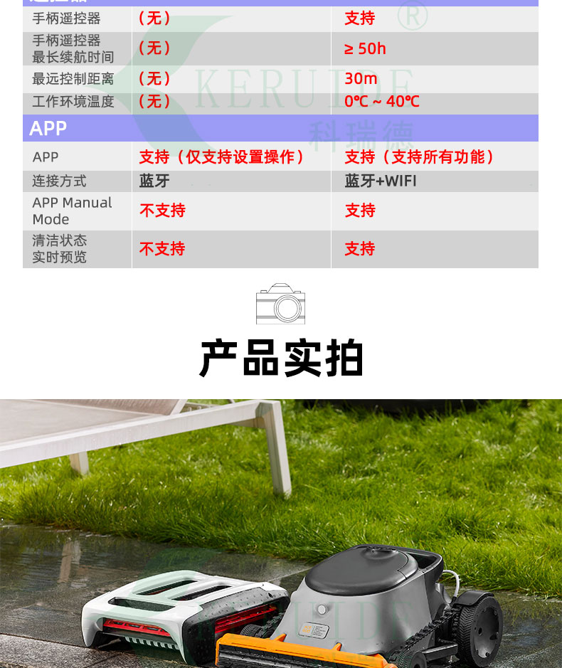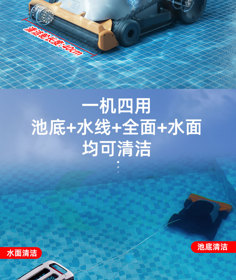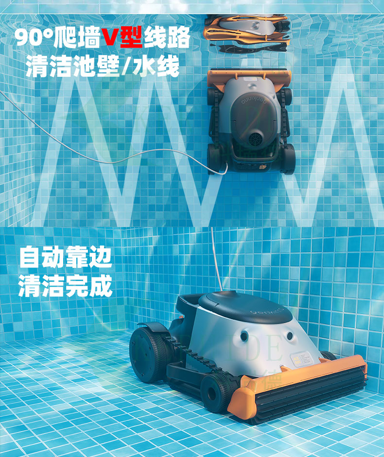 智能規劃清潔路徑,無需人工干預,可以有序的在泳池清潔,無線設計,大大提高清潔效率,