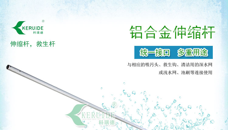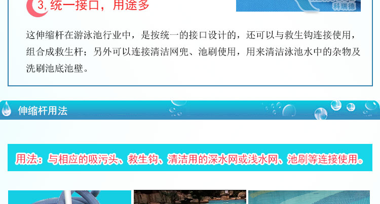 泳池伸縮桿的用處很多,可以與游泳池吸污頭,游泳池池刷,游泳池深水網,游泳池淺水網,游泳池救生鉤連接使用。如果5米的泳池伸縮桿不夠長,您可以選擇8米的伸縮桿,