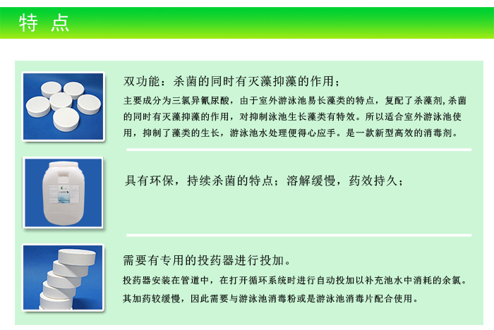 【特點】:緩溶消毒片主要成分為氯,具有消毒殺菌的作用,并且持續殺菌,殺菌的同時可滅藻抑藻,對抑制泳池生長藻類有特效。游泳池消毒和滅藻雙效合一,不喜歡每天投加游泳池水處理藥劑的私家泳池可以選擇使用此款,用加藥器自動投加,省時省力。