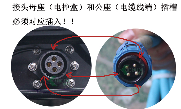2. 電控盒(電源)與電纜線連接時(shí),接頭的公頭(電纜線端)與母頭(電控盒)的插槽必須對(duì)應(yīng)插入。插線時(shí)禁止以插頭旋轉(zhuǎn)的方式來(lái)找到對(duì)應(yīng)的插槽以防接頭插槽磨損導(dǎo)致插錯(cuò)線而燒壞機(jī)器內(nèi)的電路板。