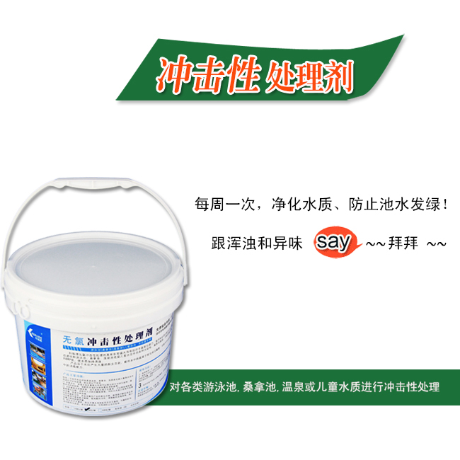 沖擊性處理是一次性加入足夠的氯或沖擊性處理劑,讓其徹底氧分解掉所有的有機(jī)物或殺滅泳池里的藻類,加入的量是直到余氯維持在某一濃度下不容易下降為止。