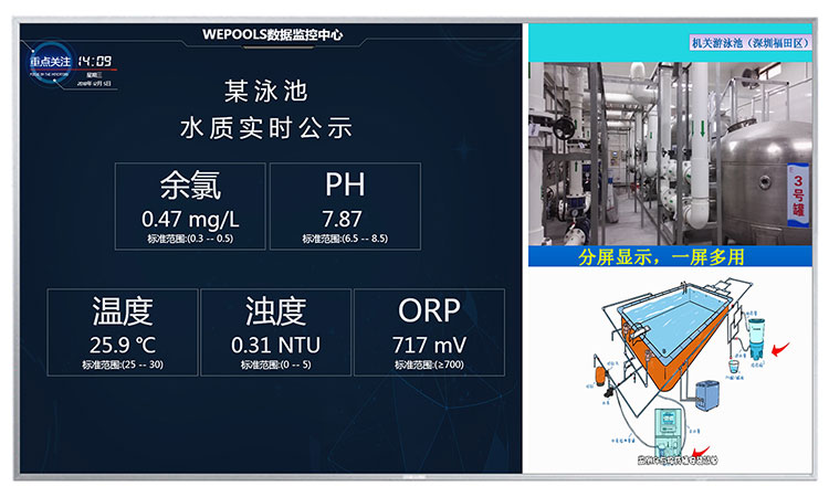 水質(zhì)實(shí)時公示屏的設(shè)計(jì)理念是為解決目前泳池手寫水質(zhì)數(shù)據(jù)公示的落后方式而研發(fā)的。目前大部份泳池都是以手寫水質(zhì)數(shù)據(jù)來進(jìn)行公示的,這個公示形同虛設(shè),根本沒起到相應(yīng)的作用。我們的水質(zhì)實(shí)時公示屏是將水質(zhì)在線監(jiān)測儀檢測到泳池的實(shí)時數(shù)據(jù)直接通過本屏進(jìn)行公示,其數(shù)據(jù)是實(shí)時、動態(tài)及真實(shí)的。并且本屏還能通過分屏設(shè)置,給公眾展示游泳場館的各類設(shè)施及宣傳,達(dá)到一屏多用的效果。