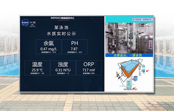 衛(wèi)普士水質(zhì)實(shí)時(shí)公示屏可顯示水質(zhì)的余氯、pH、溫度、ORP、濁度指標(biāo),并且可以一屏多用,展現(xiàn)游泳場(chǎng)館的游泳設(shè)施等。