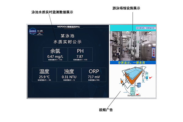 它可以將水質在線監測儀檢測到的泳池實時數據直接通過本屏進行公示,保證數據的實時性,動態及真實性。