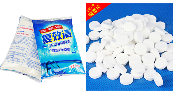 在加入殺藻劑間隔1小時后,投加消毒粉或消毒片(含氯消毒劑)進行消毒,消毒片每立方水投2-4克,消毒粉每立方水投1-2克,具體投加量按泳池總容量計算,新放的水余氯低,殺菌力弱,因此需要雙倍用量投加。