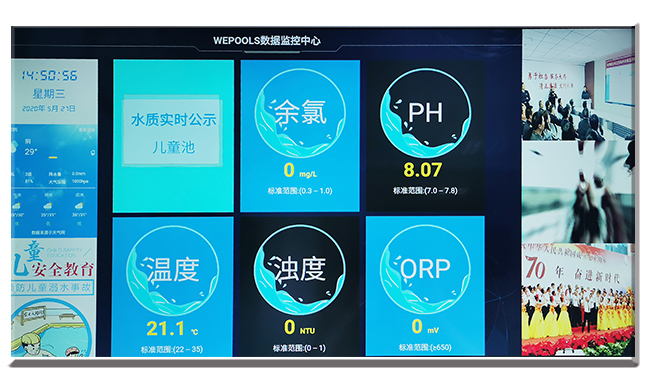 ????公示屏:水質(zhì)實(shí)時公示屏,在線監(jiān)測儀能連接到公示屏上,市民可以實(shí)時查看泳池溫度、pH、余氯等指標(biāo),公示屏有壁掛式和立式兩種,一般放在泳池旁或收銀大廳都可以。