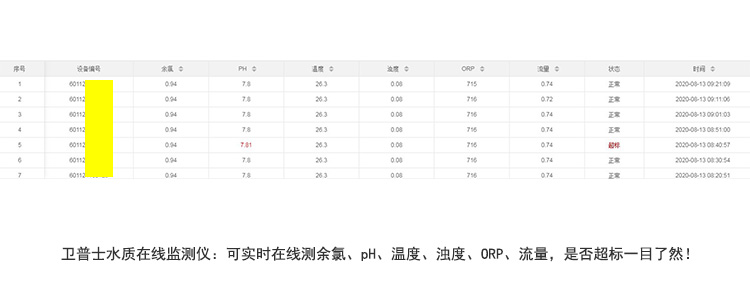 ???? 監(jiān)測設(shè)備,我們以“衛(wèi)普士水質(zhì)在線監(jiān)測儀”作為安裝在泳池的終端設(shè)備,這款監(jiān)測設(shè)備能實時測:游離性余氯、pH、溫度、濁度、氧化還原電位(ORP)等五大參數(shù),監(jiān)測參數(shù)符合游泳池水質(zhì)標(biāo)準(zhǔn),其通過傳感器將不同的水質(zhì)指標(biāo)信息收集并發(fā)送出來。