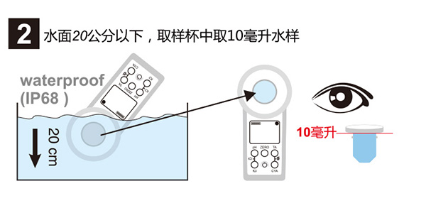 儀器伸入泳池水面20公斤以下,取10ml水樣