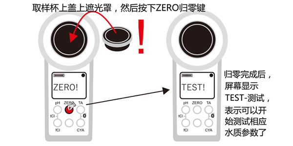 注意:儀器每次開機后,首先需要進行空白校正1次,然后就可以陸續測試不同的參數,如pH、余氯、氰尿酸等,中間無需每次都進行校正,首次校正的結果將會保持在光度計中,關機后消失。